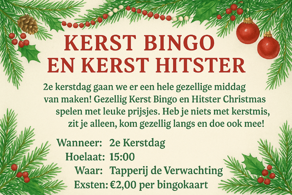 Vier de magie van de feestdagen met ons unieke evenement op 2e Kerstdag! Sluit je aan bij een gezellige groep en beleef een onvergetelijke middag vol kerstbingo en de populaire Hitster. Of je nu een doorgewinterde bingo-kampioen bent of simpelweg op zoek bent naar een leuke manier om in de kerststemming te komen, dit is de perfecte gelegenheid om samen te komen, te lachen en te genieten van de feestelijke sfeer. Mis deze kans niet om je vrienden en familie uit te nodigen voor een dag vol plezier en verrassingen. Kom ontdekken wat we voor jou in petto hebben!