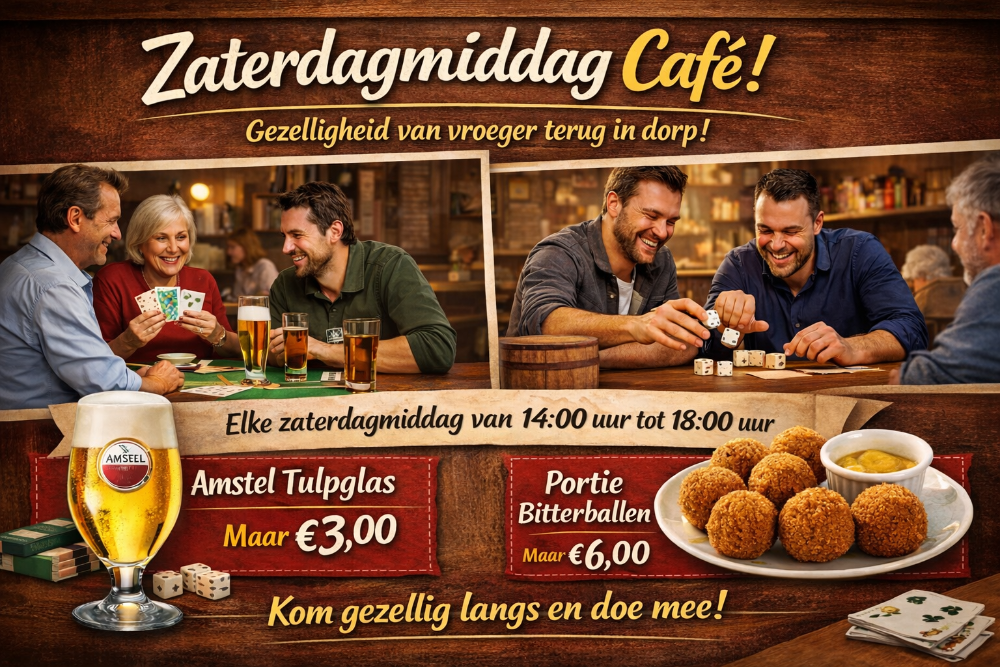Elke zaterdagmiddag Amstel tulpglas (22cl) voor € 3,00 en een portie bitterballen 8 st voor € 6,00 van 14:00 tot 18:00 uur