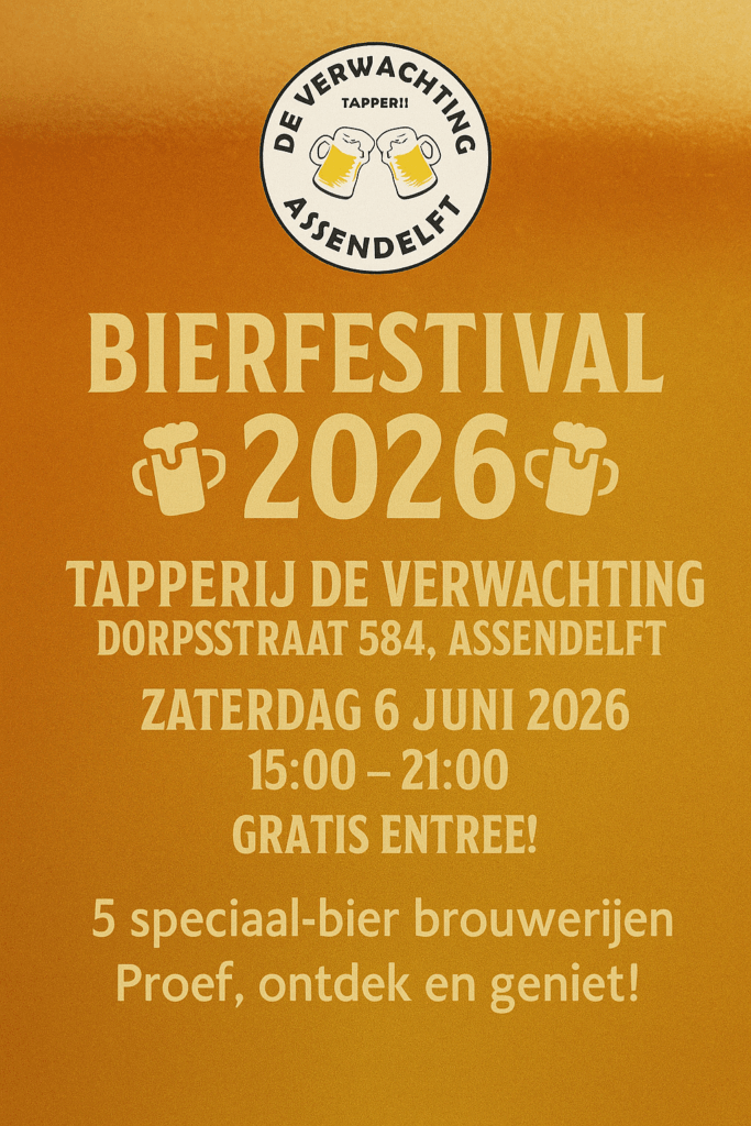 Vandaag organiseren we voor de 2e keer een klein maar gezellig bierfestival. We nodigen 5 brouwerijen uit die hun lekkerste bieren presenteren. Het festival is van 15:00 tot 21:00 buiten op het terras. Vanzelfsprekend is er ook livemuziek aanwezig.